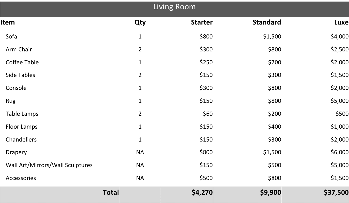 After all, it makes no sense to budget for a console table in your living room if you have no need or even room for it in the first place. Please feel free to use the information below only as guidance and an estimate.
